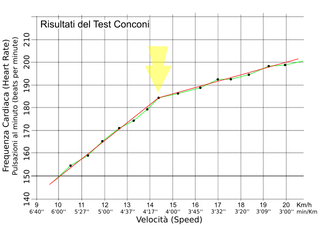 La figura in basso mostra un esempio di grafico ottenuto in seguito all'esecuzione del test di Conconi; la freccia gialla indica la soglia anaerobica.