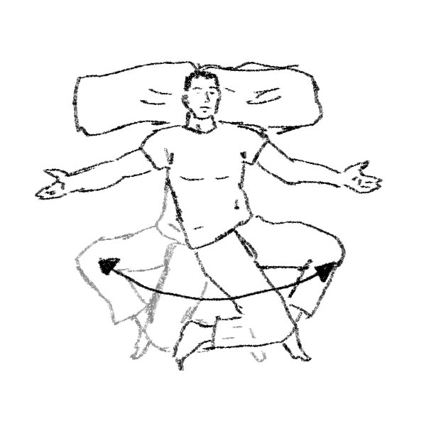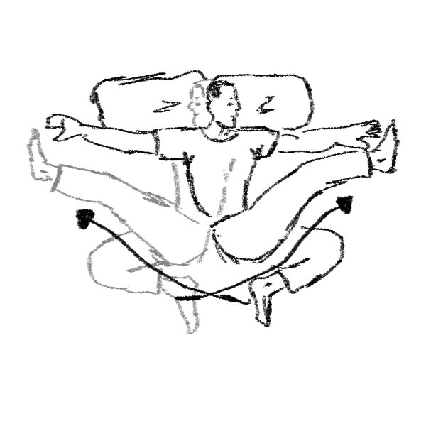 Pancia in su, braccia distese e palmi in alto. Posiziona i piedi e le ginocchia in modo che siano più larghe dei fianchi. Le gionocchia dovrebbero stare ad un angolo di circa 90 gradi. Permetti al peso delle tue gambe di aiutarti quando le porti giù. Il gionoccio in alto dovrebbe cadere giusto sotto la pianta del piede dell’altra gamba. Alterna i movimenti nelle due direzioni, 10-15 ripetizioni per ogni direzione.