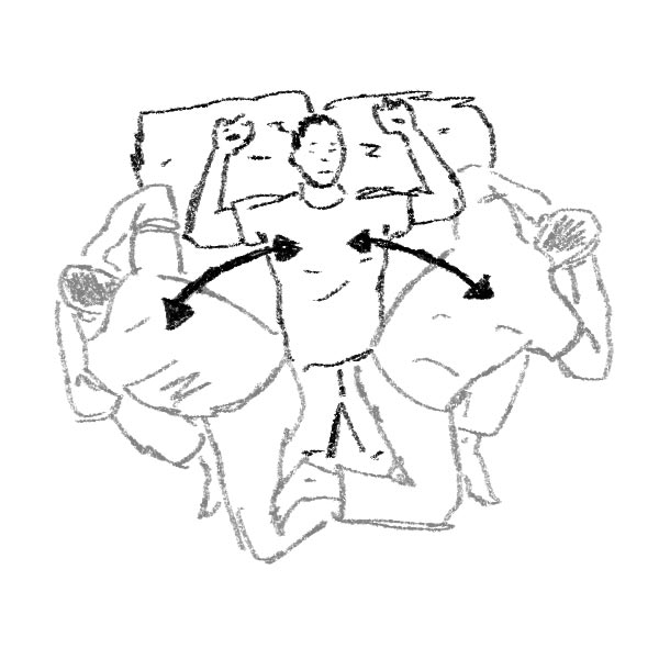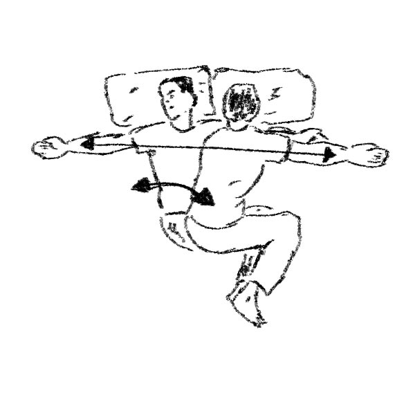 Rotola su ogni lato, sovrapponendo la spalla più in alto direttamente su quella più in basso. Posiziona le ginocchia ad un angolo di circa 90 gradi. Braccia distese. La mano che farà il movimento deve superare la mano che rimane ferma. Torna indietro con la mano aprendo il petto. Mantieni gli occhi fissi sulla mano che esegue il movimento in modo da permettere alla testa di seguire il movimento delle spallle in modo naturale. Assicurati che le ginocchia siano sempre in contatto tra loro e con il materasso. Fai 10 movimenti per poi cambiare all’altro lato.